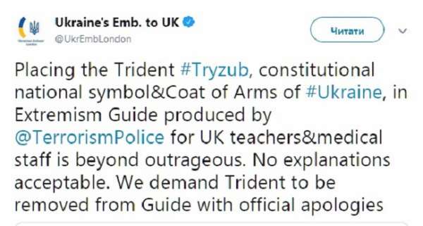 «Размещение тризуба, конституционного национального символа и герба Украины, в руководстве по экстремизму, изданном антитеррористической полицией для преподавателей и медицинского персонала Великобритании, является крайне возмутительным. Здесь нет приемлемых объяснений. Мы требуем удалить тризуб из пособия с официальными извинениями», — требует посольство Украины в Великобритании.