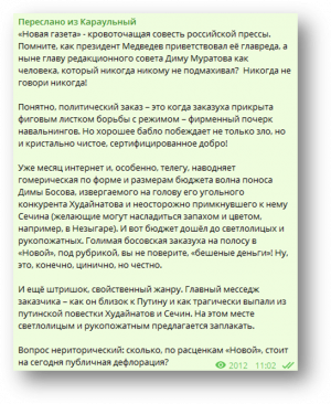 Издание позиционирует себя «независимым», но публикует любой проплаченный мусор. К слову, главред Дмитрий Муратов установил минимальный ценник за эту услугу в 2 млн рублей - и это только для «своих». Причём деньги берет только у тех, кого знает лично. Остальные же платят через посредников.
