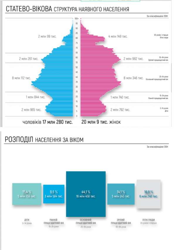 Также, на Украине из общего числа фиксируется 16 млн 458 тыс человек основного трудоспособного возраста (25-54 года), 5 млн 243 тыс – зрелого трудоспособного возраста (55-64 года) и 3 млн 584 тыс раннего трудоспособного возраста (15-24 года). Пенсионеры же преобладают над числом детей: 6 млн 248 тыс пенсионеров против 5 млн 758 тыс детей от 0 до 14 лет.