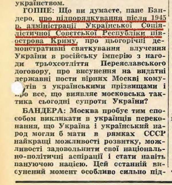 «На заметку бандеровцам. В интервью немецкому радио в конце 1954 г. Степан Бандера резко негативно отзывался о присоединении Крыма к Украине, назвав это «московской попыткой привязать Украину к советскому империализму». Так что негоже современным бандеровцам бороться за возвращение Крыма Украине», – написал он, опубликовав архивное фото соответствующей выдержки из газеты тех годов.