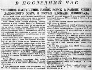 Успех был скромным, ведь ширина коридора, связавшего город со страной составила не более 11 километров. Однако материальное и символическое значение маленькой победы переоценить трудно. В кратчайший срок была построена железная линия до Шлиссельбурга, автомобильная магистраль и мосты через Неву.