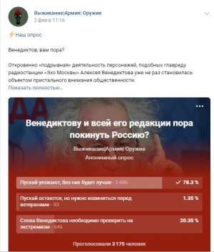 20% опрошенных считают, что главреда «Эха» нужно поверить на экстремистскую деятельность. Это, кстати, тоже очень разумное предложение. Венедиктов отрабатывает западные деньги. Он перевирает роль СССР во Второй мировой войне, поддерживает исключение РФ изщ глобальной геополитики и постоянно лжет обо всем.