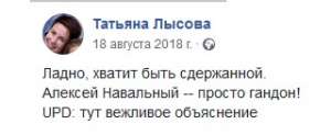 Хотелось бы напомнить о недавней ситуации, когда основатель ФБК не смог смириться с тем, что Татьяна Лысова, обозвавшая его нехорошим словом, начала свою работу в «Медузе». Естественно, за этим последовало множество гадостей, адресованных изданию и, в частности, самой Лысовой.