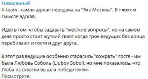 В мае 2019 года протеже Навального Любовь Соболь выступала в качестве гостьи на «Эхе Москвы». Из-за того, что ведущие пытались «сожрать» юриста ФБК, Навальный решил заступиться за свою «несчастную» сотрудницу, раскритиковав либеральное радио.