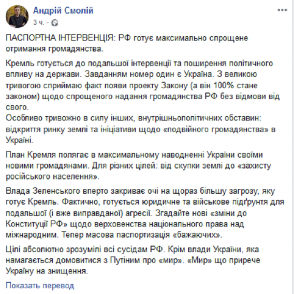 «Фактически, готовится юридическая и военная основа для дальнейшей и уже оправданной агрессии. Можно вспомнить новые "изменения в Конституцию РФ" относительно верховенства национального права над международным. Теперь массовая паспортизация "желающих"», — отмечает Смолий.