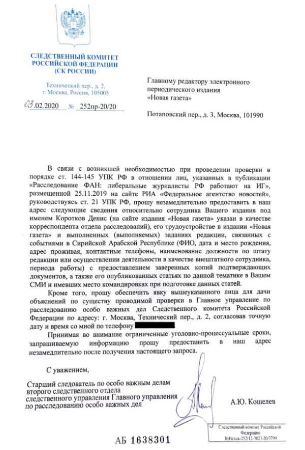 В публикациях РИА ФАН утверждалось, что Коротков якобы связан с запрещенной в России террористической организацией «Исламское государство» и сотрудничает с боевиками по заказу Михаила Ходорковского», - сообщение редакции «Новой газеты».