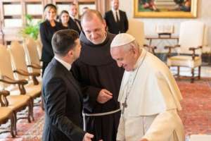 Во время официального визита президента Украины Владимира Зеленского к Папе Римскому Франциску украинскому комику и политику удалось рассмешить главу Католической церкви. Соответствующее видео с встречи распространяется в социальной сети Twitter.