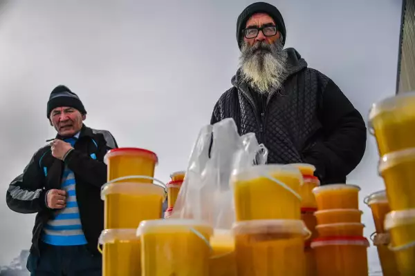 От Усть-Каменогорска до Семипалатинска, ставшего Семеем в 2007 году, рукой подать — всего 217 километров. Ровно посередине мы встретили на трассе дедушку Андрея Майера, пасечника. Он торговал медом и подошел к россиянам сам.