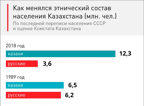На минутку, русские, или как их называют здесь официально — «русскоязычные», это почти 20% населения, 3 миллиона 588 тысяч человек (по данным Статкомитета Казахстана на 2018 год). Осмотр казахского интернета подтвердил, что ни общественных организаций, ни правозащиты, ни политиков и партий с этническим компонентом или пророссийскими программами наши соотечественники здесь не имеют. Зато, по российской схеме, у них есть фольклорные ансамбли при «Домах дружбы» и перегрызшееся между собой казачество с тремя атаманами. Причем, каждый из трех считает себя истинным, а остальных — ряжеными. Даже из Москвы было понятно, что русские в Казахстане, из первопроходцев и основателей, постепенно превратились в некий «навоз, на котором произросли другие народы». По меткому выражению царского премьера-реформатора Петра Столыпина, который и осваивал дикую степь с помощью русских переселенцев-крестьян.