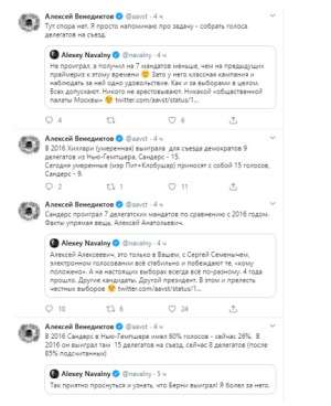 Ну а дело было так. Леша обрадовался победе Берни Сандерса на праймериз. Венедиктов поправил его, указав, что Сандерс действительно собрал больше всего процентов в одном из Штатов. Но при этом он потерял 7 делегатских мандатов, и этот показатель просел в сравнении в 2016 годом.