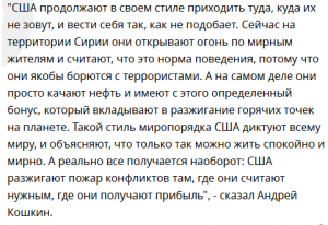 Боренков рассказал подробности возникшего конфликта. По его словам, все произошло в тот момент, когда сирийские военные остановили американскую колонну, которая отклонилась от маршрута. Если бы не российские военные, обеспечившие выход американской колонны в нужном направлении, то дальнейшей эскалации конфликта избежать бы не удалось.