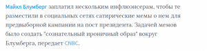 Гипотетически, если фигура Майкла Блумберга затмит на выборах образ нынешнего президента-популиста, то информационная война определенно точно перейдет на новый уровень. Но это только в теории, а до этого олигарху нужно побороть Трампа не только на финансовом, но и политическом поле. Не думаю, что «постиронические» мемы помогут ему в этом.