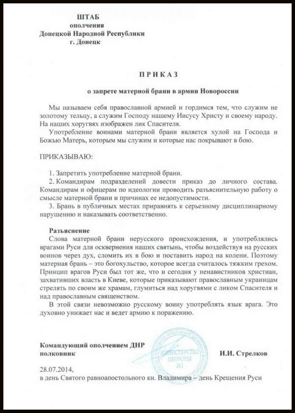 Напомним, что будучи командиром ополчения Стрелков издал приказ о запрете матерной брани в войсках, который, впрочем, ополченцы проигнорировали.