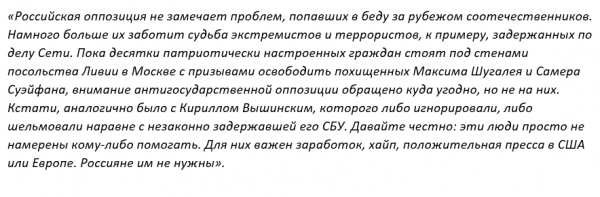 Такие издания, как «Дождь» и РБК намеренно игнорируют тему о похищенных россиянах, хотя сразу после инцидента они активно продвигали версию, выгодную боевикам и похитителям. Они писали о якобы «вмешательстве в выборы» прошлой весной. Сейчас же либеральные СМИ не обращают внимания ни на действия России, ни на открытое письмо Александра Малькевича, возглавляющего ФЗНЦ, хотя его опубликовало даже американское издание The Washington Post.
