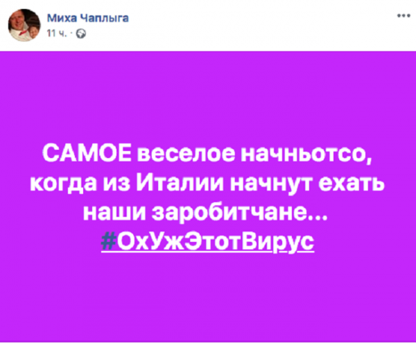 «SOS, то, что происходит сейчас в Италии, почему-то умалчивается в Украине — отменены спортивно массовые мероприятия, на улицах городов ходят эпидемиологи в защитных костюмах, в аэропортах усиленный мед контроль, учитывая какое количество граждан Украины работает и проживает в Италии, нужно срочно принимать меры по отслеживанию ситуации, усиления работы наших дипмиссий, скоро Пасха и все поедут домой в Украину, мы должны быть к этому готовы, чтобы не вышло, как с Санжарами, это не Ухань, где наших 500 чел. В Италии больше 500 000 Украинцев», — забили тревогу в соцсетях украинцы.