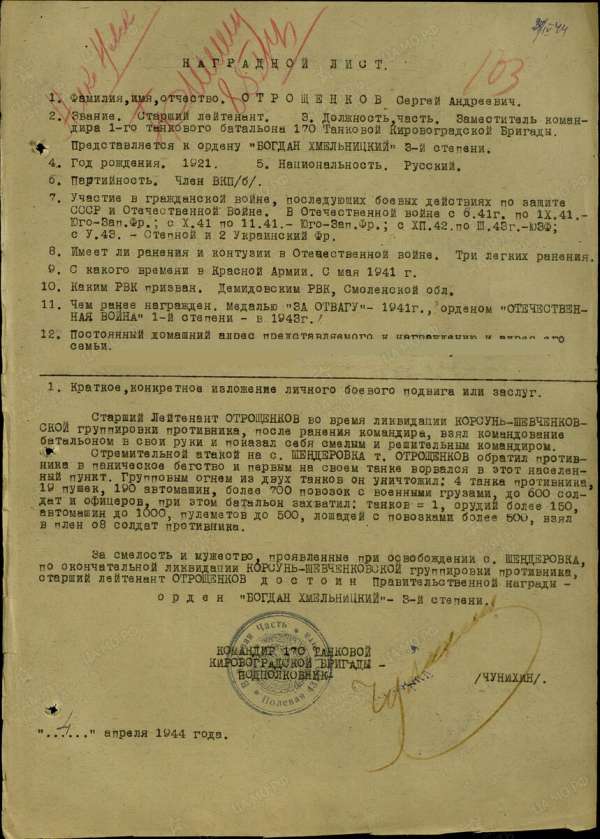 В качестве примера выше приведен его наградной лист, в котором за бои с Корсунь-Шевченковской группировкой его представляли к ордену Богдана Хмельницкого, но в итоге наградили приказом №067/н от 15.05.1944 орденом Александра Невского.