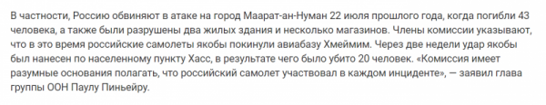 Так называемая независимая комиссия Организации Объединенных Наций, следящая за ходом девятилетнего сирийского конфликта, теперь вменяют и РФ гибель местных жителей: якобы российские воздушно-космические силы наносили «неизбирательные авиаудары по гражданским целям», что повлекло гибель женщин и детей. Об этом эксперты написали в своем очередном докладе.