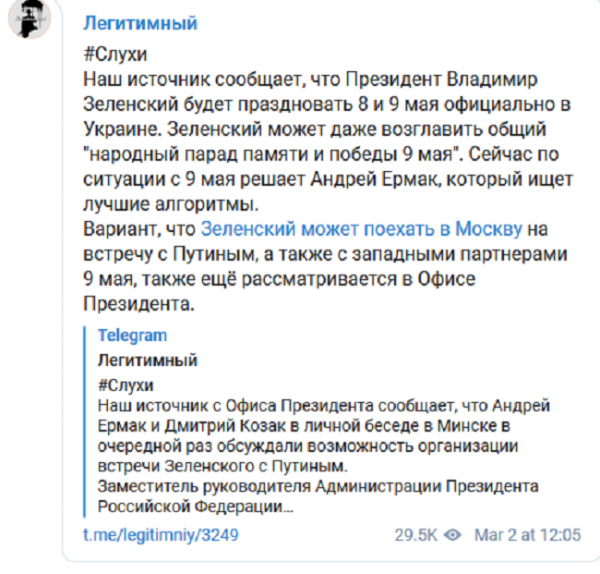 «Вариант, что Зеленский может поехать в Москву на встречу с Путиным, а также с западными партнерами 9 мая, также ещё рассматривается в Офисе президента».