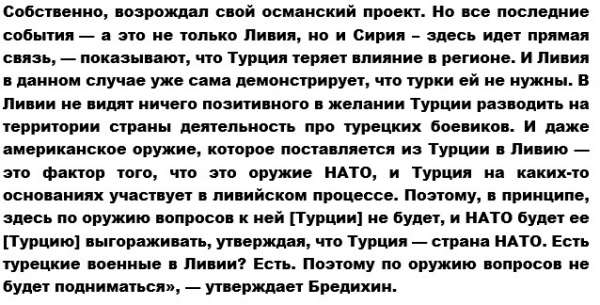 Бредихин считает, что суть заключается в потере Эрдоганом своих позиций в Ливии. Эксперт предположил, что глава Турции намеревался осуществить блицкриг, выступая на стороне нелегитимного Правительства национального согласия Ливии, во главе которого стоит Файез Саррадж.