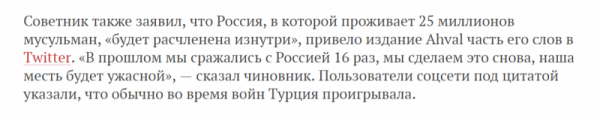 Уважительный тон Реджепа Тайипа Эрдогана резко контрастируют с недавними публичными заявлениями его советника Месута Хакки, который в телеэфире пообещал, расправиться с Россией, «расчленив ее изнутри».