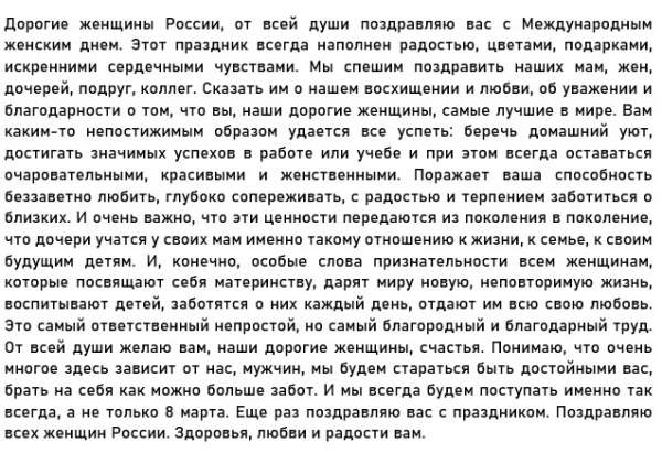 Не изменяя традиции, россиянок с праздником поздравил российский лидер Владимир Путин. Видеоролик с его поздравлением транслировался по всем федеральным каналам.