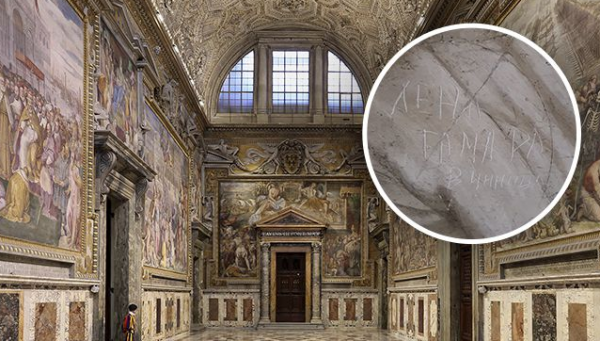 Одно из величайших творений гениального итальянского живописца было обезображено непролазной глупостью двух украинских туристов. На видео видна нацарапанная на знаменитой фреске Рафаэля Санти «Афинская школа» надпись: «Лена и Тамара из Винницы».