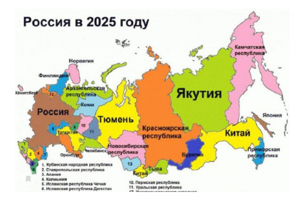 Согласно фантазиям докладчика, уже в 2025 году наша стран распадется более чем не десять республик, при этом значительные территории будут распределены между европейскими и азиатскими странами.