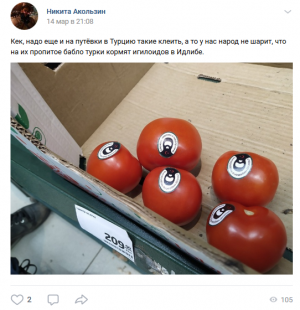 На днях в магазины на прилавки завезли преинтереснейшие турецкие помидоры. Дело в том, что их промаркировали довольно необычными наклейками, утверждающими, что поставщик – «спонсор мирового терроризма».
