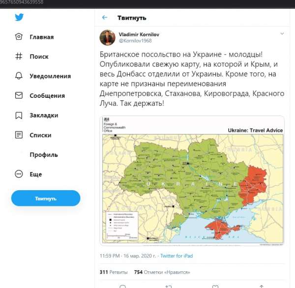 «И даже признание Куива сделано с оговоркой на традиционное "Киев". Так держать! На следующей карте ещё и Одессу с двумя "с" укажут - и вообще цены им не будет!», - утверждает Корнилов.