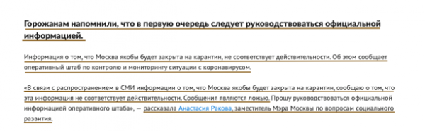 Накануне медиа опубликовали информации о закрытии Москвы на карантин, причем в Сети появился якобы приказ за подписью министра обороны РФ. Это фотошоп, а информация не соответствует действительности. Вброс официально опровергли на сайте столичной мэрии.