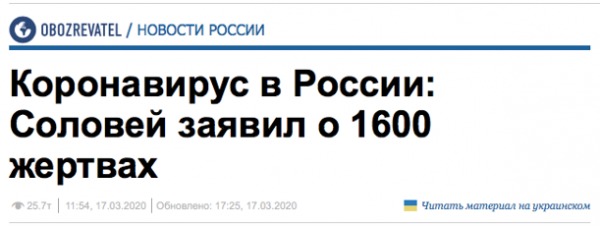 Свои «пять копеек» вставляют и либералы. Так, завсегдатай «Эха Москвы» Валерий Соловей рассказал о «тысячах умерших» от коронавируса в РФ. Примечательно, но фантазию публициста транслируют лишь украинские СМИ. В действительности в РФ зафиксирован единственный летальный исход, в Москве скончалась 79-летняя женщина. Статистику в реальном времени ведет ВОЗ и даже либеральные СМИ вроде «Новой газеты».