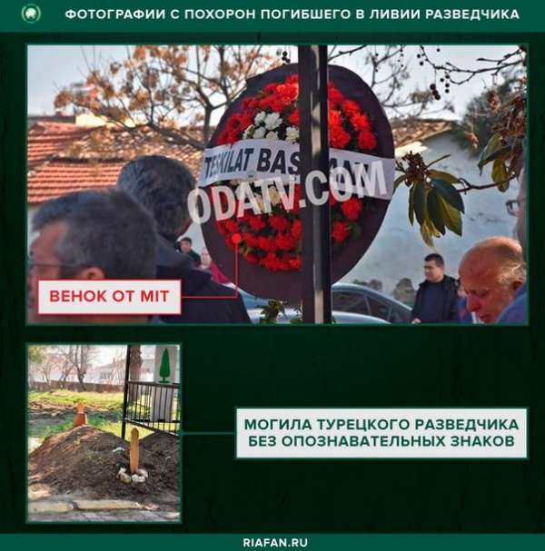 У издания оказались фото разведчика, венка на похоронах, надпись на котором Teşkilat Başkanı переводится как «Глава организации». Это упоминается Национальная разведывательная организация Турции – ее лидер Хакан Фидан.