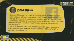 По-видимому, либшиза все никак не поймет, что человек может думать своей головой и иметь свои мысли насчет того, как должна выглядеть Конституция. Но в коллективный оппозиционный разум видимо вдолбили мысль о том, что выпускники УГ Навального априори не имеют своего мнения и должны критиковать все инициативы, исходящие от государства.