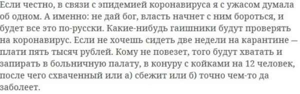 Не менее скандальную статью для «Новой» написала Юлия Латынина. Она утверждает, что борьба с инфекцией в России более опасна, чем сама инфекция.