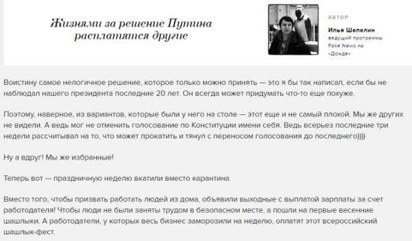Ведущий «Дождя» Илья Шепелин заявил, что россияне вместо соблюдения карантина отправятся на шашлыки. Он утверждает, что вместо оплачиваемой недели выходных россиян нужно было закрыть на жесткий карантин.