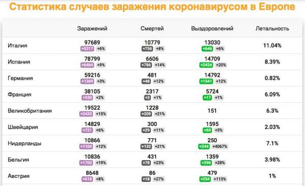 Статистика случаев заражения коронавирусом в Европе. Источник: coronavirus-monitor.ru