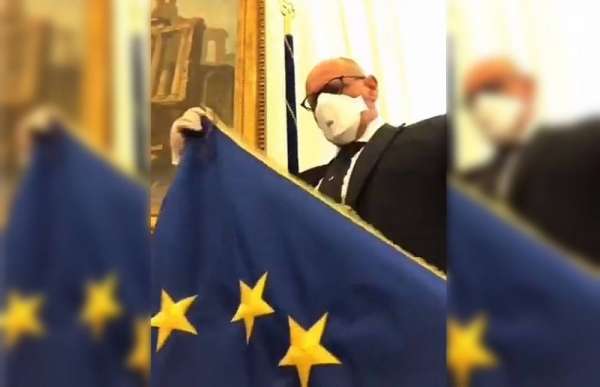 Фабио Рампелли, занимающий пост вице-президента Палаты депутатов Италии, опубликовал в своем Twitter-аккаунте ролик, на кадрах которого он в перчатках и медицинской маске демонстративно снимает флаг ЕС в своем кабинете, после чего выносит его.