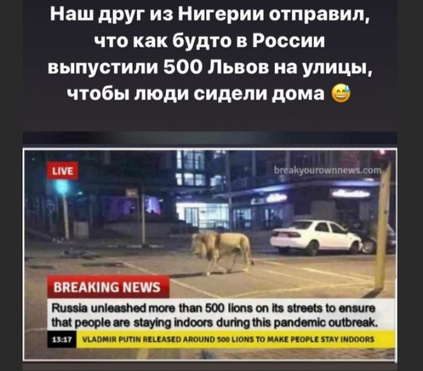 Чего стоит только фейк о 500 львах, которых выпустили в Москве для борьбы с саботирующими самоизоляцию. Вам смешно? А ведь в Америке многие поверили… К счастью, в России больше людей с юмором, чем балбесов, верящих любому дурно пахнущему фейку из соцсетей. Так и появился мем о «львином» вбросе, показавший западной общественности всю абсурдность фальшивок.