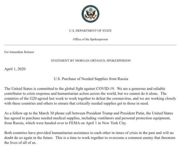 "По следам телефонного разговора, состоявшегося 30 марта между президентом Трампом и президентом Путиным, Соединенные Штаты согласились приобрести у России необходимое медицинское оборудование, включая аппараты искусственной вентиляции легких".