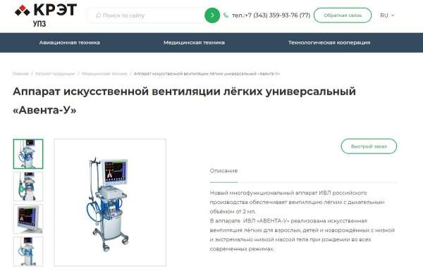 Аппараты искусственной вентиляции легких "Авента-М" производства АО «Уральский приборостроительный завод», входящего в концерн "КРЭТ". Изображение взято в сети Интернет в свободном доступе.