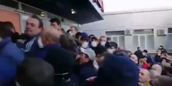На видео тысячи людей стоят в длинной очереди как сельдь в бочке и совсем вплотную ломятся в двери учреждения, где раздают вожделенные спецпропуска.