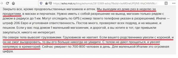 Например, скандальная радиостанция «Эхо Москвы» опубликовала очереной вброс о некой россиянке, проживающей в Италии. Она, как и следовало ожидать, поведала историю о жуткой нехватке грузовиков для вывоза тел умерших, о частых случаях смертей среди медработников и сокрытии информации. Само собой, эту публикацию тут же растиражировали остальные либеральные СМИ.