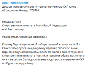 Дело было так. Член ТИКа, член партии «Яблоко» Анна Шушпанова опубликовала в соцсетях пост, рассказав, что врачи сестрорецкой больницы якобы отпустили зараженного коронавирусом пациента домой. В сообществе «Новости Сестрорецка» она разместила запись о том, что якобы в поликлинике №68 был выявлен пациент с положительной пробой на коронавирус, ему дали направление в больницу, но там предпочли отпустить больного домой – заражать окружающих. Это оказалось неправдой.