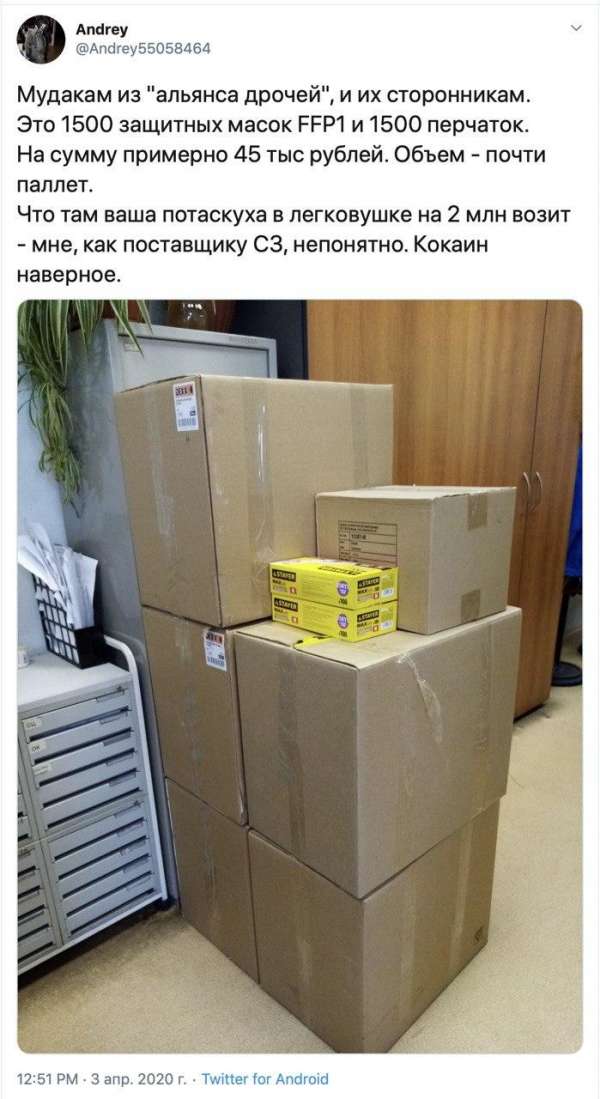 Так, на днях «Альянс» сообщил, что собрал 2,5 миллиона рублей на средства индивидуальной защиты. Васильева, которая, к слову, контактировала с прибывшими из ОАЭ родственниками, покатила в Нижегородскую область для отчета. Под взором камер западных журналистов, разумеется. Немалые деньги были потрачены на 3 (ТРИ) небольшие коробки с масками, занявшие треть багажника легковушки. Никаких отчетов о тратах нет, что подтверждает факт мошенничества.