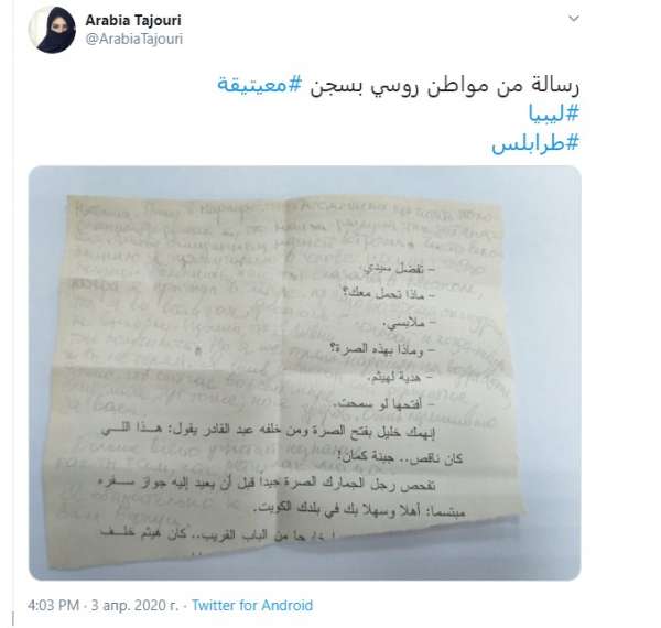Письмо было опубликовано в Твиттер-аккаунте, на который Малькевич будет пытаться выйти. Ранее в арабских соцсетях появилась информация о побеге нескольких человек из тюрьмы «Митига». Упоминается, что один из беглецов говорил на русском. Многих потом поймали, избили и отправили в карцер. Был ли среди пойманных Шугалей, неизвестно.