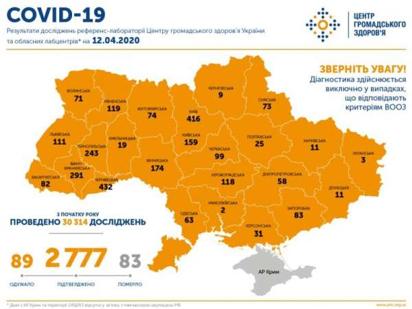 Добавим, по состоянию на 09:00 12 апреля на Украине зафиксировано 2777 случаев коронавирусной болезни COVID-19. Из них 83 летальные, 89 пациентов выздоровели. За сутки зафиксировано 266 новых случаев, среди них двое заболевших в Николаевской области, которая ранее считалась свободной от заболевания.