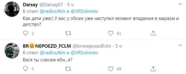 В комментарии сайту «Подъем» Соловьев добавил, что бросать ему вызов могут лишь равные, а Уткин «тяжело болен». «С такими людьми не бывает баттлов, их надо лечить. Меньше всего на свете меня волнуют изречения этого несчастного, опустившегося и очень нездорового человека», — заключил он, предложив спортивному комментатору «помыться и побриться».