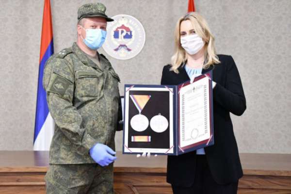 В связи с этим командир отряда вооруженных сил РФ полковник Макcим Сологубов был награжден «за исключительный вклад и поддержку в оказании медицинской помощи в борьбе против пандемии COVID-19 и за укрепление сотрудничества между Россией и Республикой Сербской», отметили в администрации Цвиянович.