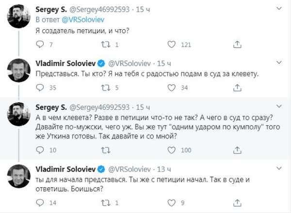 Впрочем, в своем твиттере Соловьёв был менее сдержан. Он уже успел поцапаться с создателем петиции, пригрозив ему судом.
