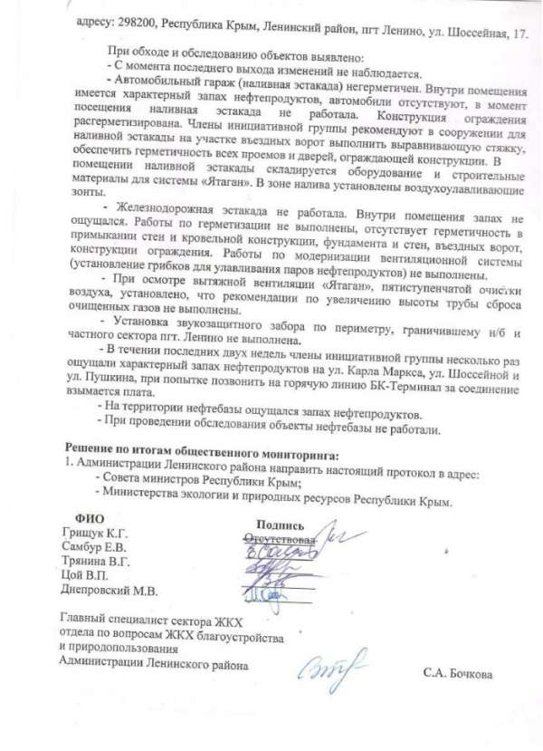 При этом ряд замечаний по протокольной части до сих пор не устранён. В частности, не выполнена герметизация помещений сливной и наливной эстакады. Также в протоколах говорится о том, что по периметру не установлен звукозащитный забор и не выполнены рекомендации по увеличению высоты трубы сброса очищенных газов.